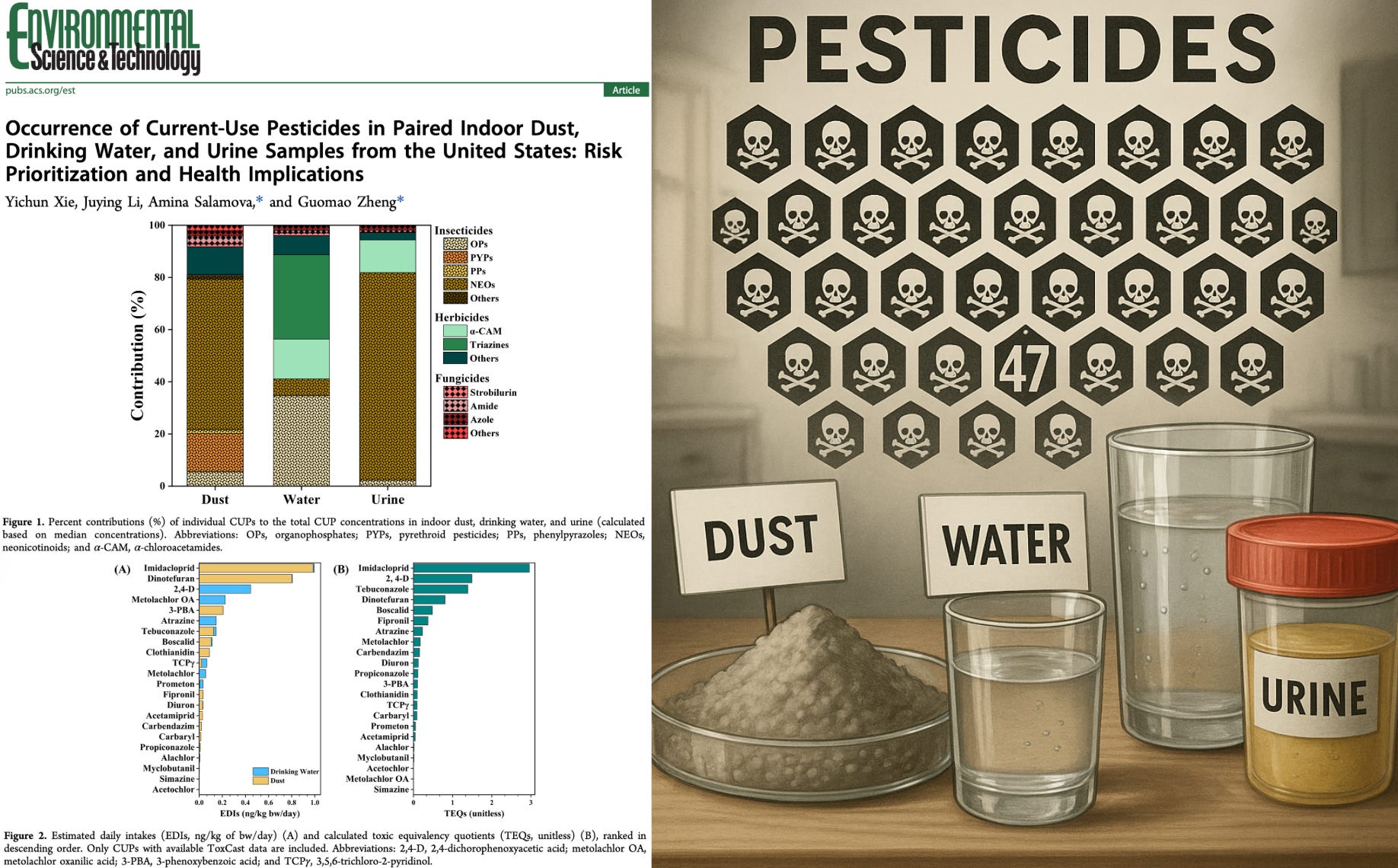 A new peer-reviewed study in Environmental Science & Technology has delivered a wake-up call: our homes are not safe havens from pesticide exposure. Researchers tested indoor dust, drinking water, and urine from 81 U.S. households and found that 47 current-use pesticides (CUPs) — including insecticides, herbicides, and fungicides — are now part of our everyday environment and our biology.