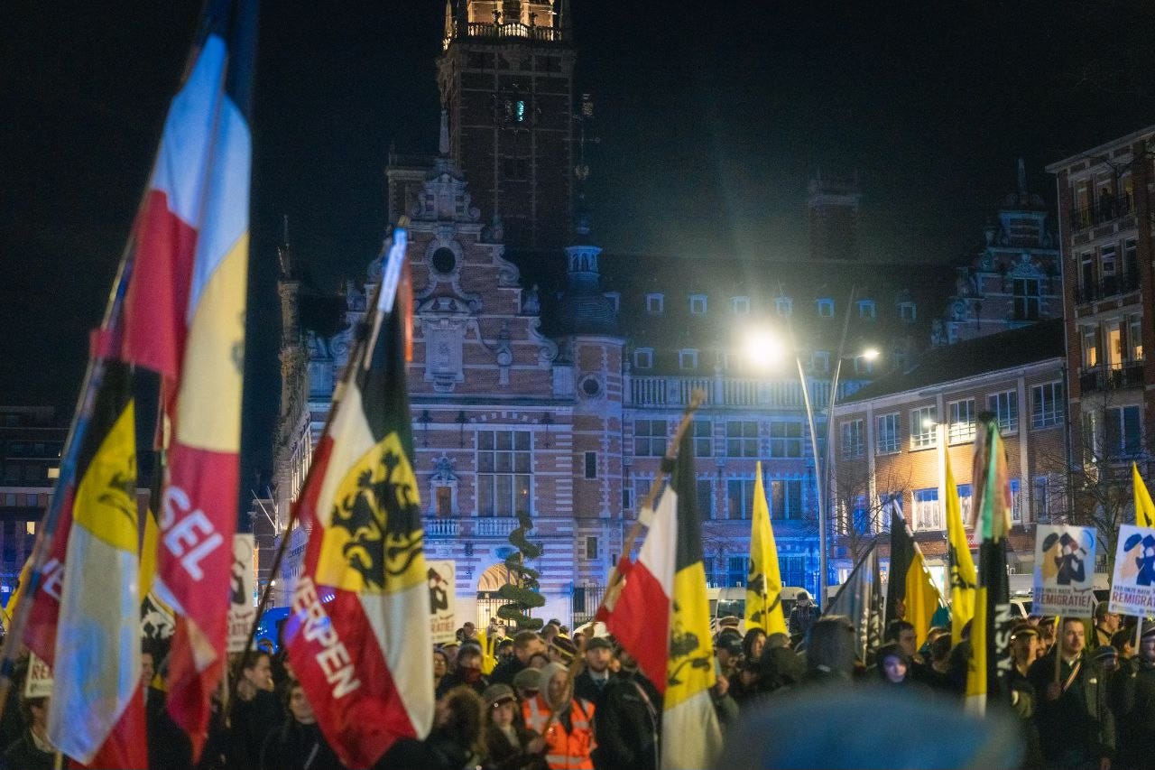 At 6pm, the demo against fascism started near the central station. Around 600 mentally handicapped creatures made it clear that the NSV! did not have a place in their city. But what actually is the NSV!? It seems their fame has skyrocketed these last two years after the successes of their previous demonstrations in Antwerp and Ghent, but I doubt many people actually know what they stand for. The NSV! is a Flemish-nationalist, economically Solidarist, National-Revolutionary student union founded in 1976 in Antwerp, and can be recognised by their iconic black-white-red student ribbons and their grey student hats. A separate article on European student culture is in the works, so I will not expand on the meaning and history of these attributes yet, but I can say that this group works as a sort of middle ground between the more radical National-Revolutionary movements (CasaPound Italy, Groupe Union Défense) and the Identitarian groups (Identitäre Bewegung, Geuzenbond). The fact that one student union can connect these two streams of nationalist thought to work towards one goal is quite the feat on its own. The unity that I saw in Leuven is something we should strive for at all times.