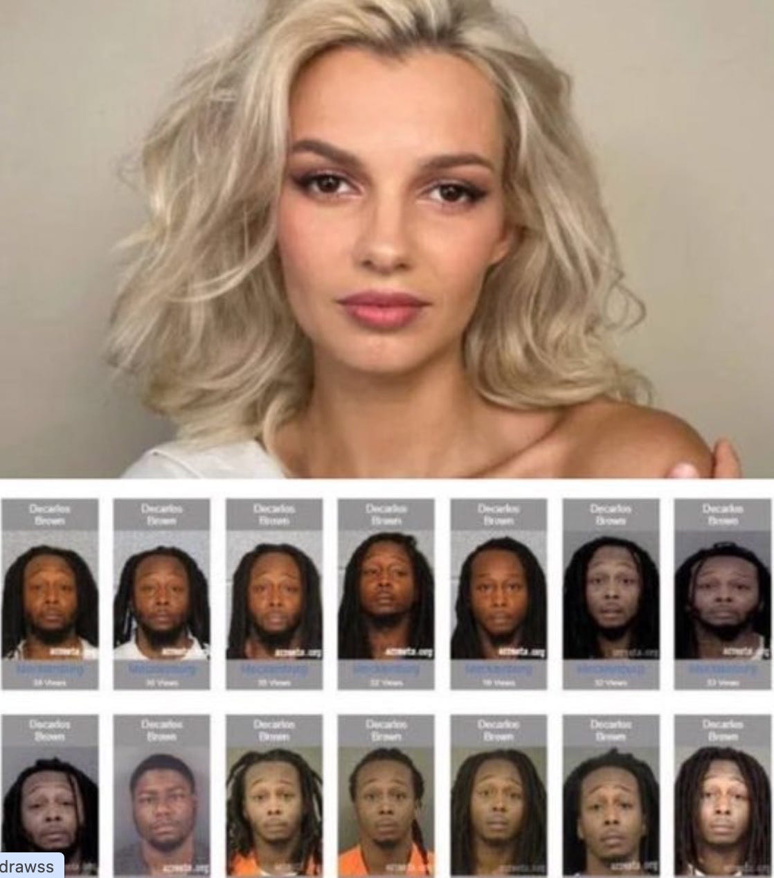 The third image is of the victim—23-year-old Iryna Zarutska—combined with a collage the offender’s fourteen mugshots from his previous arrests.
