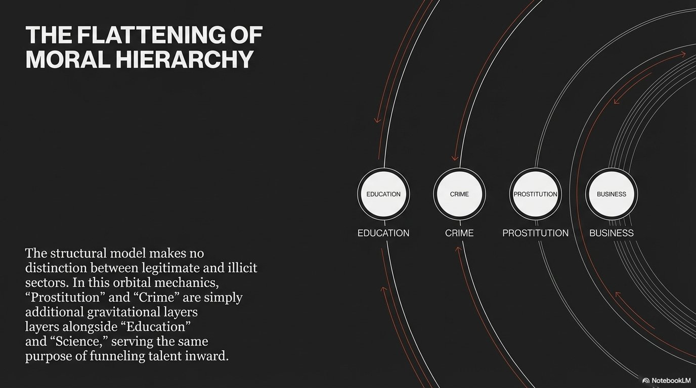 A critical feature of this system is the irrelevance of starting points. The source context emphasizes that “it doesn’t matter where you start from.” This creates a profound meritocratic paradox: the system rewards the highest achievement in “clean” fields, such as science and education, with entry into the same “unclean” nucleus occupied by those from the spheres of crime and prostitution. This reveals that the most “sacred” and the most “profane” social tracks share an identical terminal velocity toward the Epstein network.