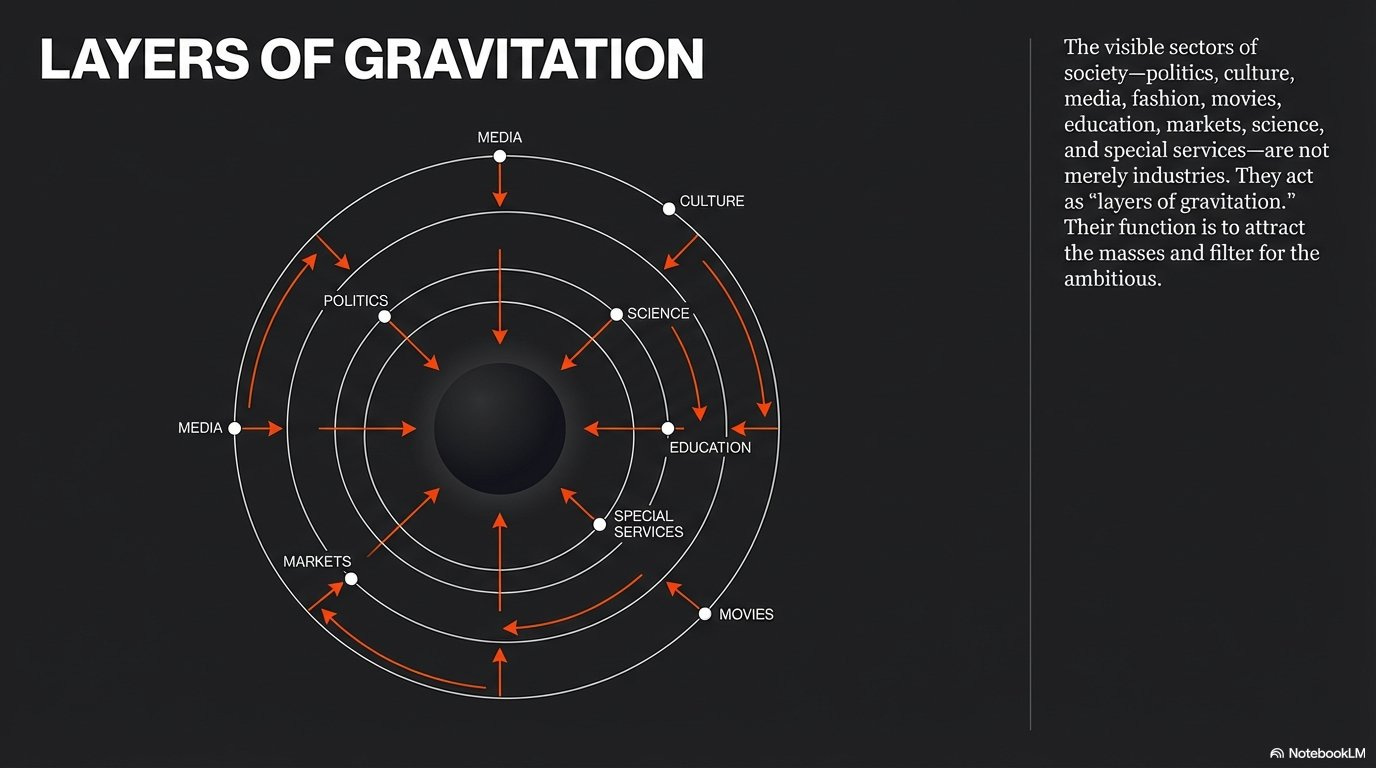 The stability of the Epsteino-centric core is maintained by a series of “gravitational layers.” These layers function as a dual-action mechanism: they provide the necessary “attraction of the masses” to sustain the system’s legitimacy and energy, while simultaneously filtering and accelerating high-performing individuals toward the center. These circles are not independent entities but are interconnected components of a single, unified gravitational field.