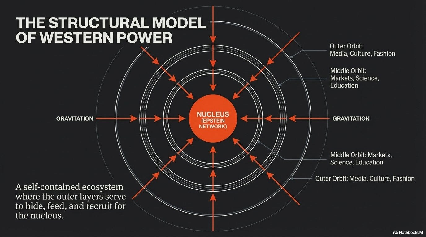 The “Epsteino-centric” thesis posits that the Epstein network is not a peripheral anomaly or a tangential scandal; it is the fundamental core—the very nucleus—of the Western power structure. This model argues that the architecture of the collective West is organized around this center, with every major social pillar acting as a “layer of gravitation.” While conventional analysis treats fields such as science, fashion, and politics as independent silos, the gravitational metaphor reveals how these seemingly unrelated paths of high-level success converge upon a shared point of origin and control. Understanding this nucleus is the only way to accurately map the trajectory of the modern elite.