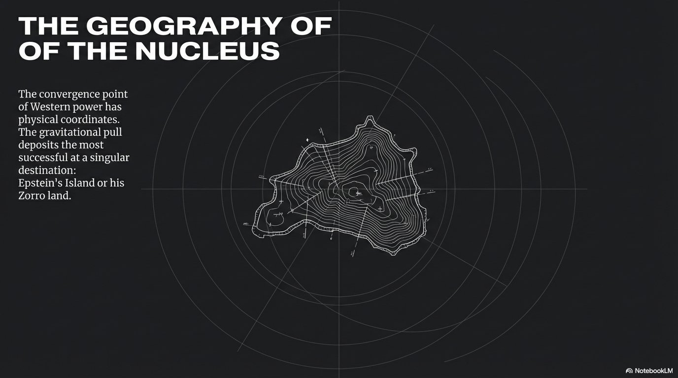 This sociopolitical analysis identifies a Western power architecture that is far more centralized and cohesive than public narratives suggest. By synthesizing the relationship between the nucleus (Epstein’s Island/Zorro land), the gravitational layers of social institutions, and the trajectory of elite careers, we find a system of total convergence.