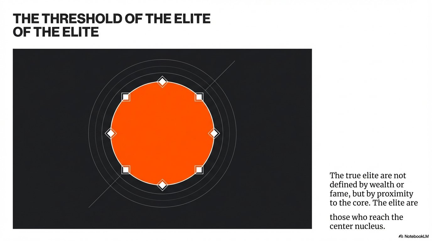 The “Real Elite” are not defined by the mere accumulation of wealth or the acquisition of official titles. Instead, elite status is strictly predicated on reaching this nucleus. It serves as the definitive threshold—the final filter—separating general high-achievers from those who occupy the inner sanctum of global structural power. Reaching the center signifies that an individual has transitioned from being a professional success to becoming a functional component of the Western core.