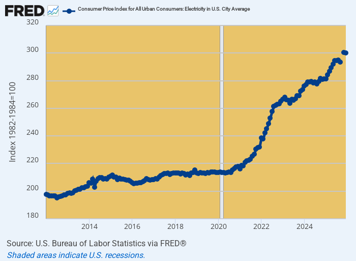 Needless to say, the political hot potato of “affordability” does very much come to mind when you take a gander at the CPI electricity graph below. On a nationwide basis, electric bills rose by +6.7% during the first twelve months of the Donald’s second term, and that was just more of the same punishment to household budgets that has been underway since February 2020.