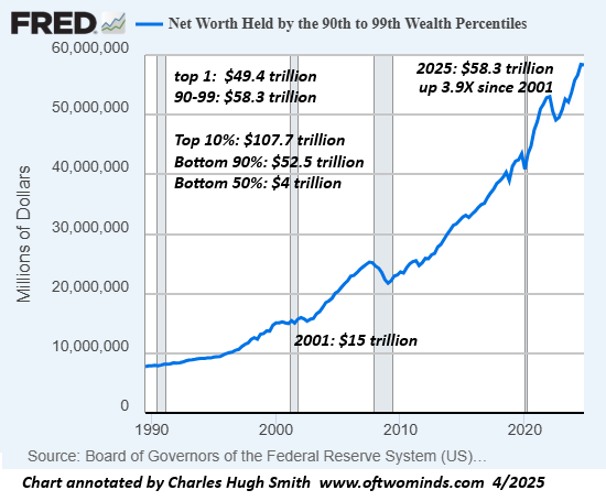 The desired goal of permanent asset-bubbles is the “wealth effect,” the cover story for transferring all the gains into the hands of the top 10%, who can then go on a spending spree which ‘trickles down” to the bottom 90%, who are now a neofeudal class of workers serving the top 10% who account for 50% of all consumer spending and collect 90% of the unearned income and capital gains.