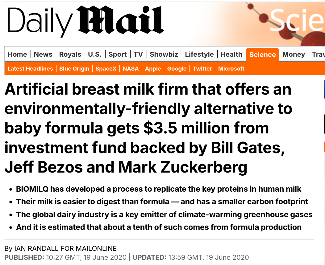 While being sold to the public as a ‘green alternative for baby formula’, they have been working to ‘artificially produce human breast milk from cultured human mammary epithelial cells on a commercially viable scale’.