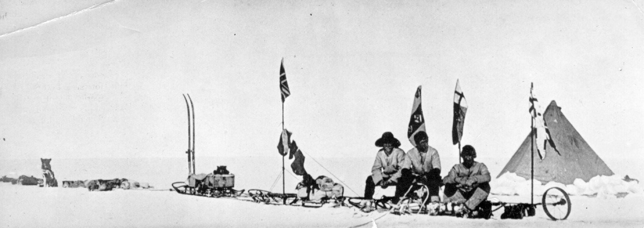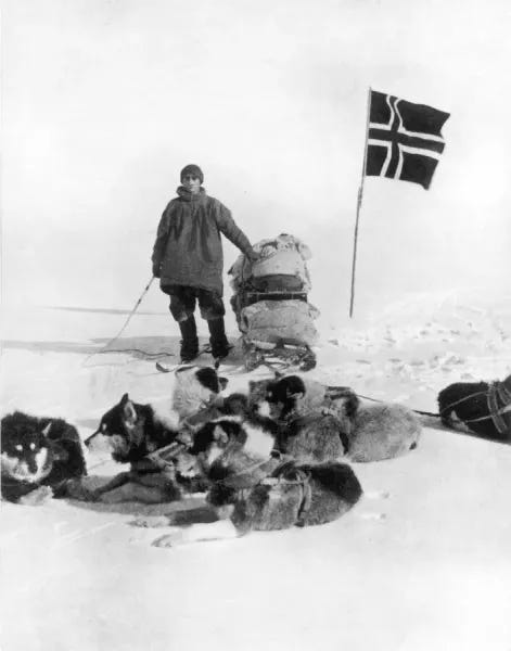 The race to the Pole in 1911–12 was thus more than polar exploration; it was a grand gesture of this Faustian Western ambition. On the white horizon, two men tested that impulse in different ways. Roald Amundsen’s Norwegian expedition was an experiment in precision and discipline: “I may say that this is the greatest factor – the way in which the expedition is equipped, the way in which every difficulty is foreseen, and precautions taken… Victory awaits him who has everything in order”.12 This southerly turn by the veteran polar mariner was no whimsy; it was meticulous engineering of a conquest. Amundsen brought 116 dogs, skis, and experience from the Arctic, strode along an unexplored glacier route, and methodically covered roughly twenty miles a day. On 14 December 1911, thirty-five days before Scott’s arrival, Amundsen’s team proudly planted a Norwegian flag at the Pole.1314 Amundsen’s attitude was summed up by his pithy maxim: “Adventure is just bad planning.” In his ledger, success belonged not to the bravest or luckiest, but to the man who prepared best.15