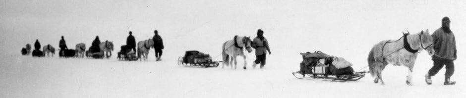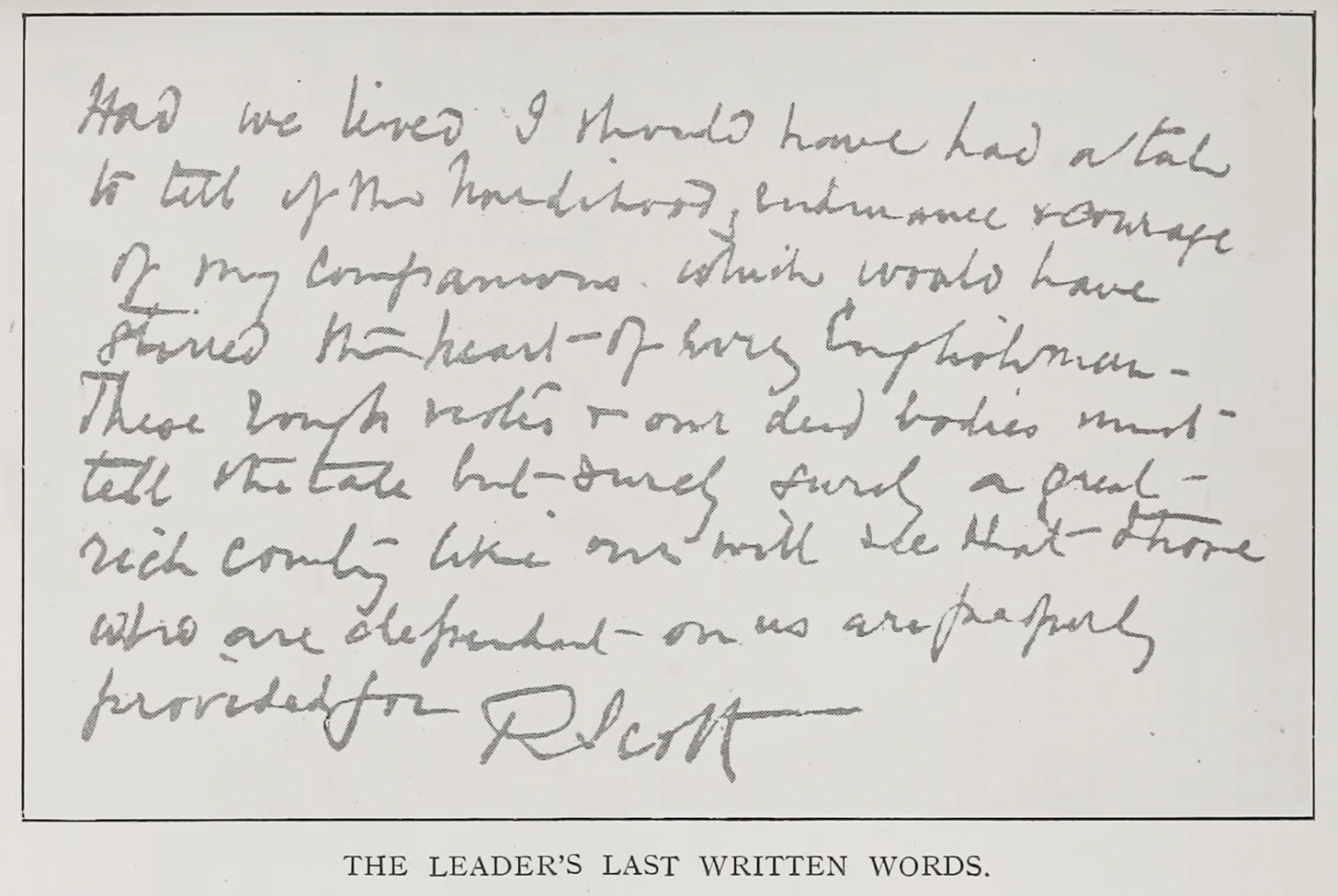 In contrast, Scott’s approach was steeped in imperial romance. The British party included motor sledges and ponies alongside dogs, reflecting a naval-era bravado and experiment. Scott celebrated endurance and sacrifice as ends in themselves. His diaries brim with appeals to providence and honour, he viewed the journey as an imperial duty to “carry our country through” hardship. The discipline was monastic: he described the men as a small “republic” united by duty, not by skepticism or self-interest.16 When Amundsen’s expedition appeared days before Scott, Scott could only note it with grave honour: a letter that Amundsen left under his tent’s flag said simply that they “did not return safely,” and he wrote respectfully of the Norwegians’ achievement. Yet, in the end, Scott’s crew of naval officers, with their gentlemanly code of stoicism, marched on much longer despite little chance of survival.