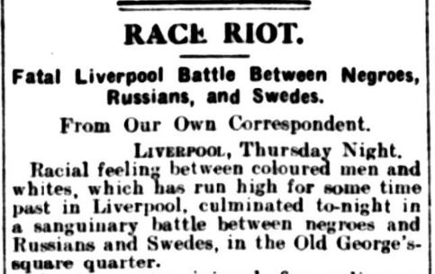 Reporting on the rioting, the London Daily News noted that ‘racial feeling’ had been running ‘high for some time past’. Time and time again, the key issues were described as being rivalry for jobs and the newcomers either going out with or accosting white women. (5) Once the violence began, however, the anger of the mobs was roused mainly by the aggressive self-defence employed by negroes in particular.