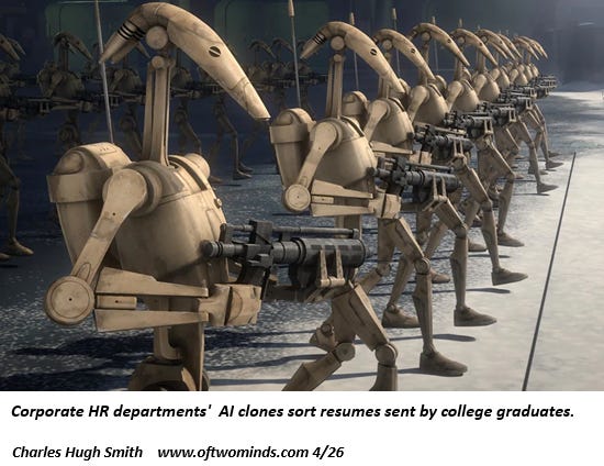 Which brings us to college graduates sending out 90 resumes and being ghosted or rejected by the cloned HR (Human Resources) bots deployed by all 90 corporate employers to weed out everyone but those few with the requisite experience. Which in the case of recent collage graduates, is near-zero because they’ve been university students with minimal opportunities to gain high-value / intensive work experience.
