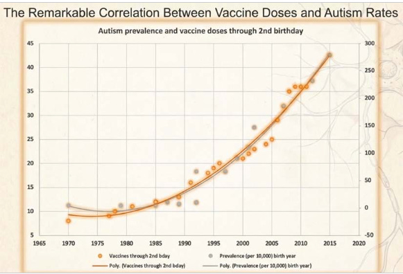 Autism rates have grown enormously over the past few decades. This increase shows a remarkable correlation to the number of vaccine doses given to infants. I have a chart here which plots both of those — both the vaccine doses and the autism rates — on the same chart with the same time scale.