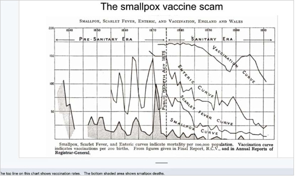 The top line of this chart shows vaccination rates for smallpox back in the 1800s. The bottom area, the bottom shaded area shows smallpox deaths. You will notice that deaths from smallpox declined as vaccination rates declined, so the vaccine could not have been responsible for the reduction in smallpox.