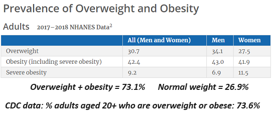 Traditional calculations find about 75% of the adult populace is overweight/obese and 25% are normal weight.