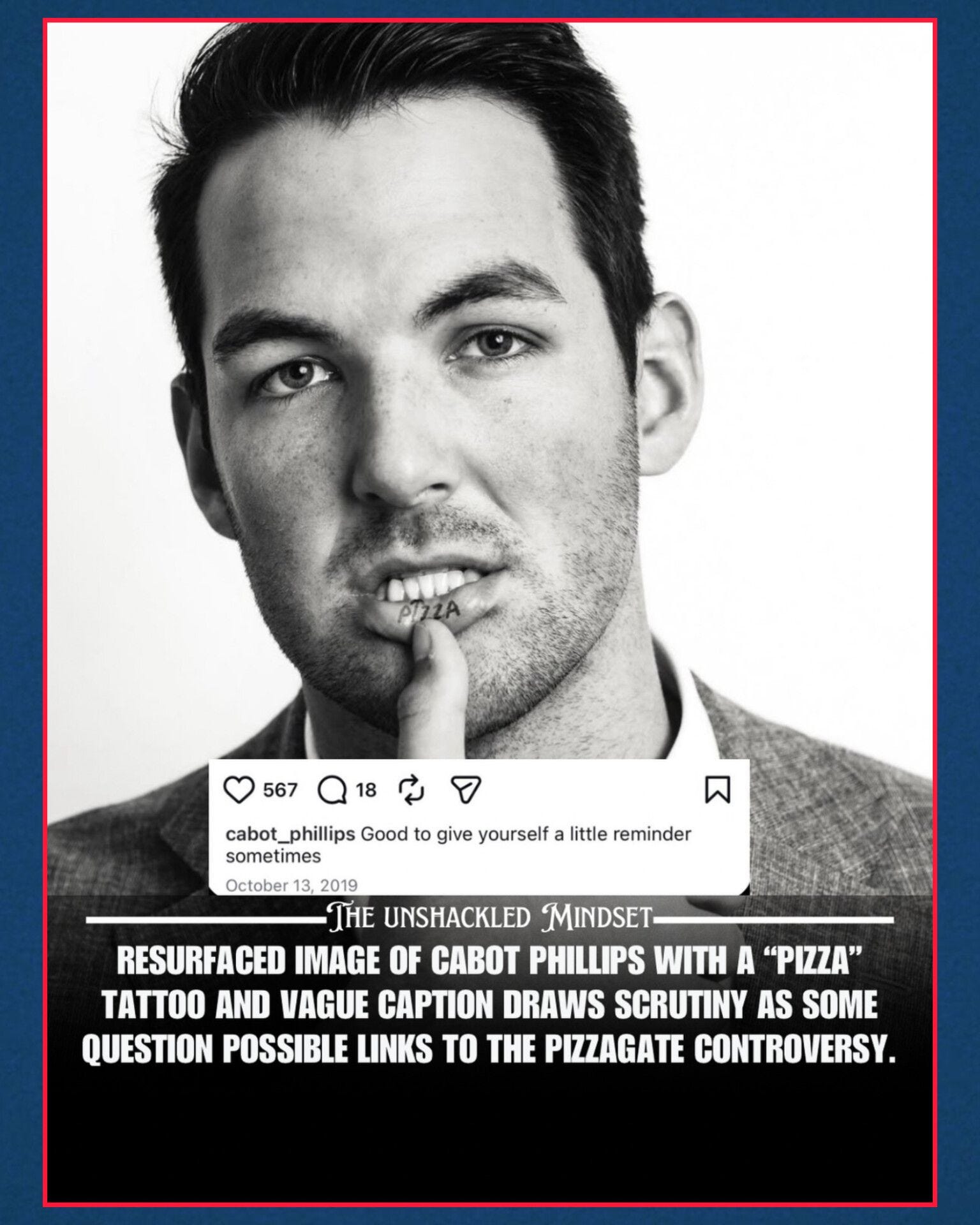 This Cabot Phillips now works for Turning Point USA. He used to work for the Daily Wire. You know, Israeli Firster Ben Shapiro’s outfit. Cabot was supposedly seen at Fort Huachuca right before the Kirk assassination. With Erika. Now, Alex Jones and others have angrily debunked this. Well, be that as it may, Cabot has posted a picture of his…unusual tattoo on social media. First of all, the tattoo is on his inner lip. That’s an odd place, and certainly must have been especially painful. But you go through pain for your art, or big club, or whatever. Second, the tattoo is of the word “Pizza.” Oh. You mean the same word bandied about so frequently in the Podesta emails, and in the Epstein files? Cabot is intense about this subject, and has said, “Pizza talk is the new pillow talk.” That doesn’t make sense if you’re talking about the delicious food we all love. It does if it’s code for sex with children. A Facebook user describing Cabot’s book shelf wrote, “One book is called ‘c@nnibalism’ that is so disturbing. The next one is Stiff, ‘the curious lives of human c@davers’ and possibly the most concerning is ‘Rise and k*ll first, the secret history of Israel’s targeted assass*nations.’”