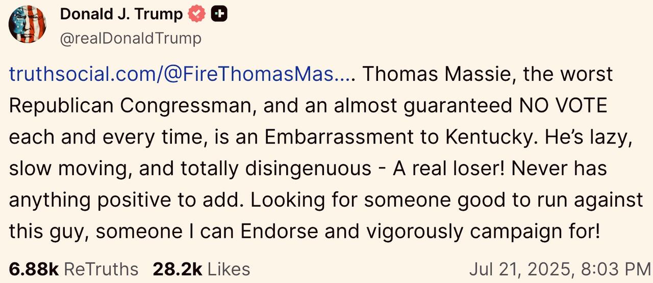 Already angry at Massie for opposing the One Big Beautiful Bill and Trump’s unconstitutional bombing of Iran, Trump last month promised to back a primary challenger to Massie, and the Trump team immediately launched a Super PAC for that sole purpose. On Monday evening, Trump attacked Massie again, calling him “a real loser” and “an Embarrassment [sic] to Kentucky,” while again soliciting would-be challengers.