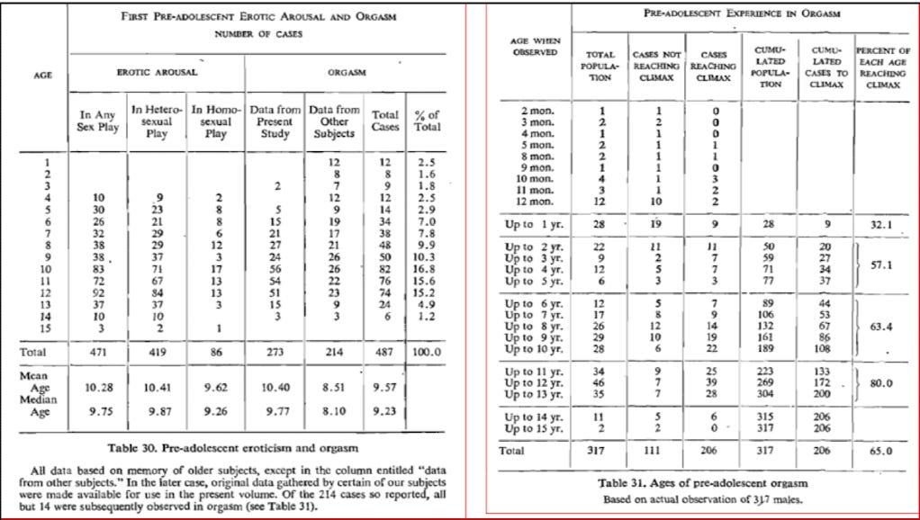 Small children (including infants of two and three months old) were stripped naked, with their arms and leg restrained while their genitals are exposed and stimulated. One four-year old boy, Kinsey wrote, “climaxed” 26 times in a 24-hour period of continuous stimulation. The techniques involved were self-masturbation by the child, child-child sex play, and adult child contacts chiefly manual or oral. In addition to these adult “scientists” stimulating the child’s genitals with their mouths, tongues and/or fingers, Yorkshire Television’s documentary, Secret Histories: Kinsey’s Paedophiles revealed evidence that genital penetration (sodomy), formed part of Kinsey’s “interview” technique.