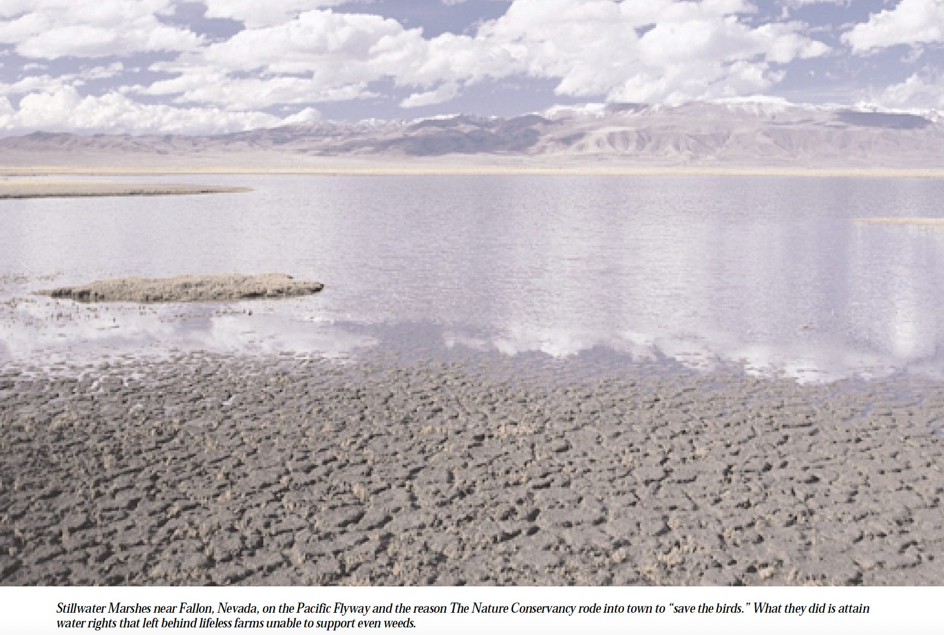 But Chisholm got his marsh “save” and a promotion to director of the wealthiest chapter of the Nature Conservancy in California. He was praised and celebrated and today is acclaimed for “saving” countless “treasures,” with no mention of the ruination in his wake. But by the time of his promotion, the affection for Chisholm in the Lahontan Valley community was long dead, especially when they discovered that Chisholm had been operating under a memorandum of agreement between TNC and the Fish and Wildlife Service to buy the water rights and shift them to the government, leaving, as Tim Findley put it, “ghost farms and pale, lifeless fields of laser-leveled ground unable even to support the growth of weeds.”