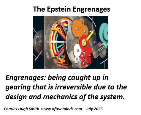 This web of influence wasn’t just about money–and Epstein had plenty to distribute–though that was a key attractor; it was also about joining the “club” of elites whose path to the top was cleared of obstacles and who avoided accountability by having the “right contacts” and “legal advisors.” That too is a powerful attractor to the ambitious seeking insider status.