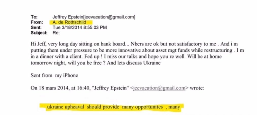 The three pieces of evidence that jumped at me, were first, Epstein’s note to Ariane Rothschild that destroying the government of Ukraine would be very profitable.