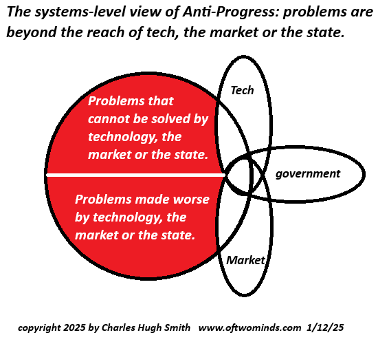 Muller and Packer dismantle every conventional “solution” as inadequate or worse: more education, more policy tweaks, financial gimmicks–all are fake fixes that avoid the hard part, which is addressing the underlying decay in both our society and economy that has replaced “solutions” with self-enrichment.