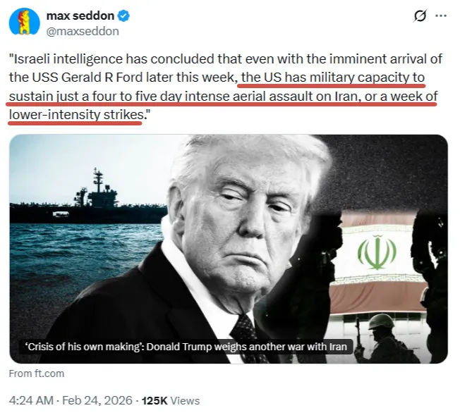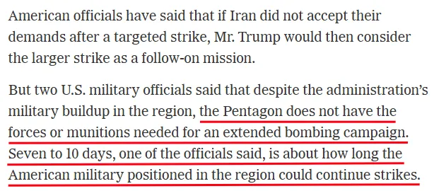 An official estimated that current US forces in the region can sustain attacks for only 7 to 10 days, limiting the feasibility of a prolonged military operation.