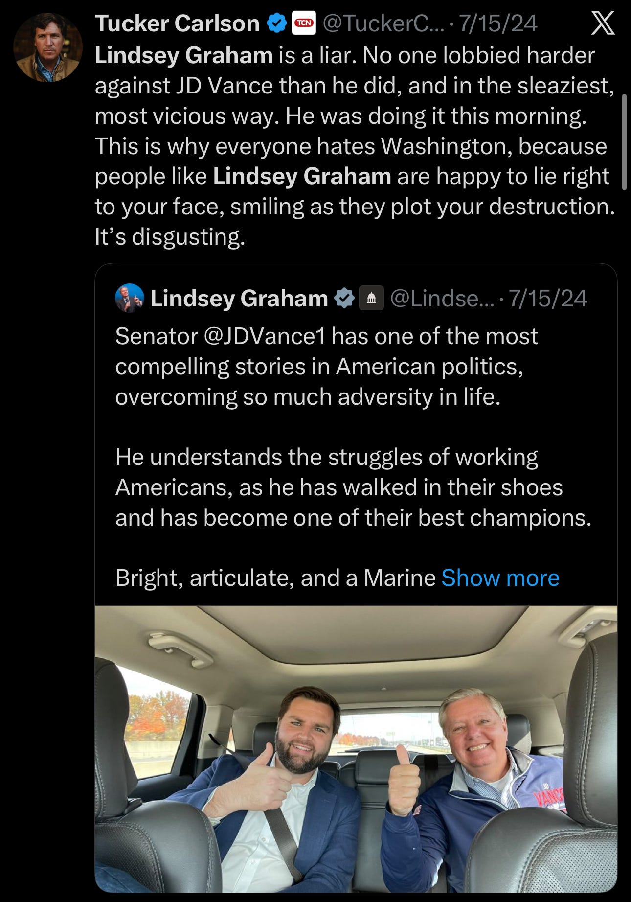 - Tucker countered the establishment by pushing Trump toward JD Vance — the VP choice every donor bloc tried to stop.