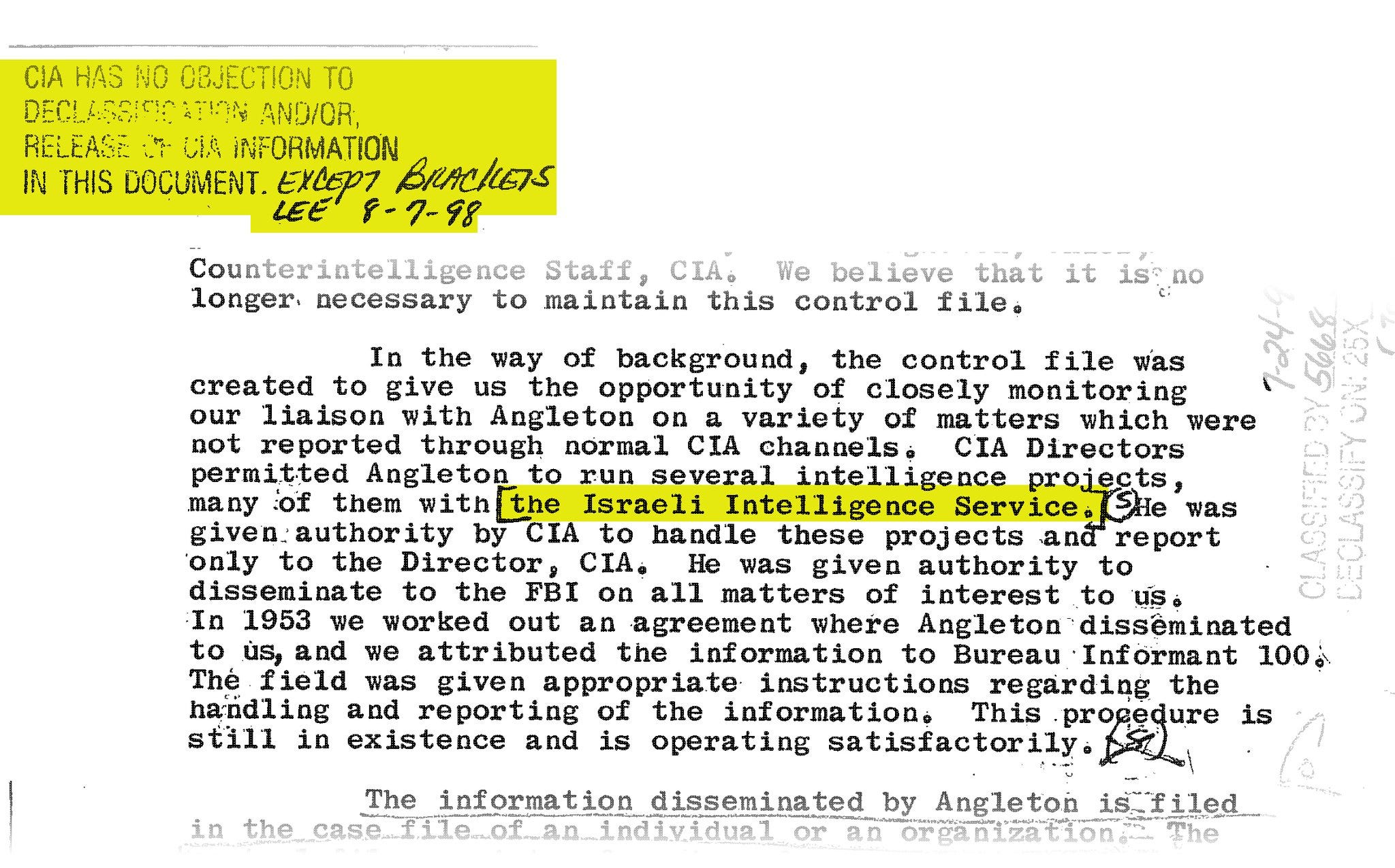 all Angleton files were cleared for release except those involving his Israeli intelligence projects.
