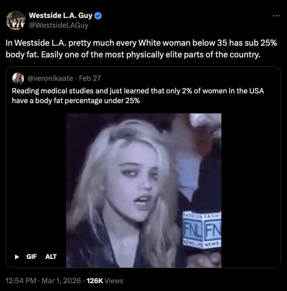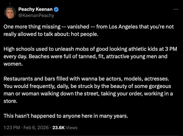 Attractive women came to LA to become starlets, stayed to create a social scene, and then settled down, married a rich guy, and passed down their genes into the upper class. A lot of various Millennial actresses also grew up in LA’s upper middle class suburbs. Due in part to the DEI takeover of the entertainment industry, far fewer attractive women are being hired for acting and behind the scenes roles, thus, there is less induced demand for attractive women from all over the country to seek their chances in LA. Even if DEI is being rolled back somewhat, the entertainment industry is in decline and leaving LA for economic reasons, as well as AI, which could wipe out Hollywood.