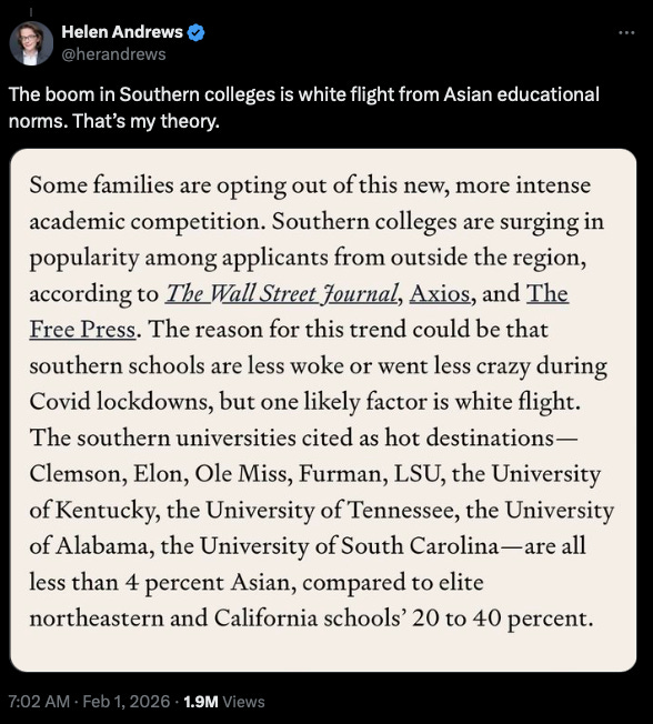 We are seeing the bust of the echo boom in that the LA region had a ton of local attractive White Millennial girls that grew up on the Westside, nice parts of the Valley, and in various suburbs from Calabasas to Manhattan Beach. GenX was a smaller generational cohort than zoomers, which explains why Zoomers are a smaller cohort than Millennials, on top of a lot of Genxers getting priced out of LA’s housing market by Boomers. Despite being a larger cohort, a lot of Millennials can’t afford to start families in SoCal, so they either stay as aging hipsters or move out to Arizona, Texas, or Washington to start families. Meanwhile, there is a trend of affluent White zoomers in California attending universities in the South, as a reaction to both DEI and Asian grindset culture, but also the popularity of Southern frat and sorority culture from TikTok.