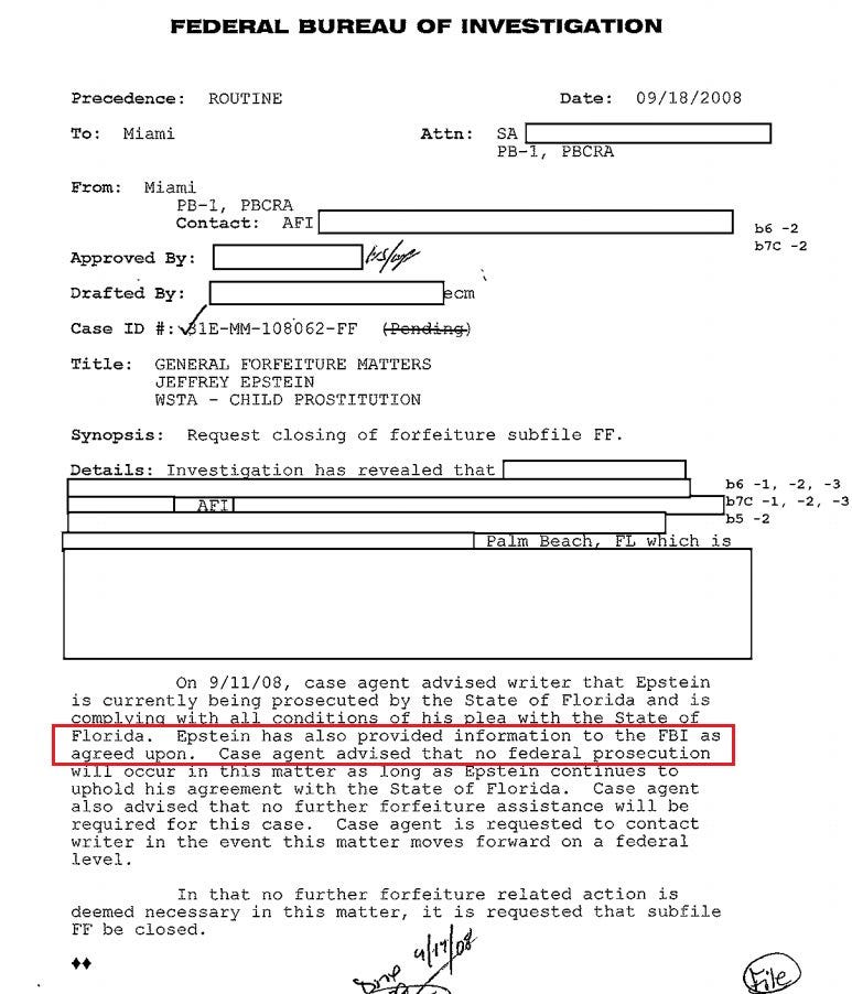 The document, titled “ROUTINE,” stated unequivocally that as long as Epstein cooperated with the State of Florida and kept providing the Bureau with material, no federal prosecution would proceed.