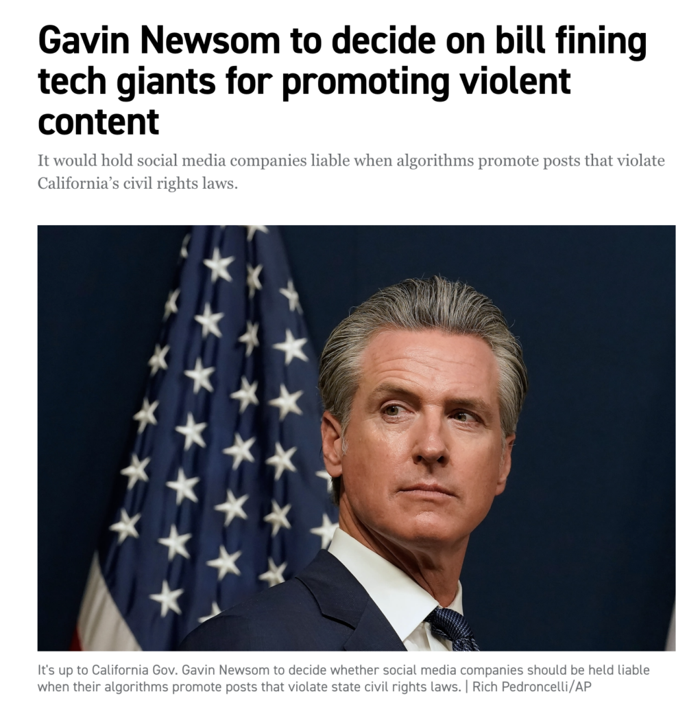 Ironically, Newsom is pushing a bill to fine social media companies for promoting violence online, even as he sends not-so-subtle signals to his own unhinged followers that maybe they should take aim at some so-called “fascists.”