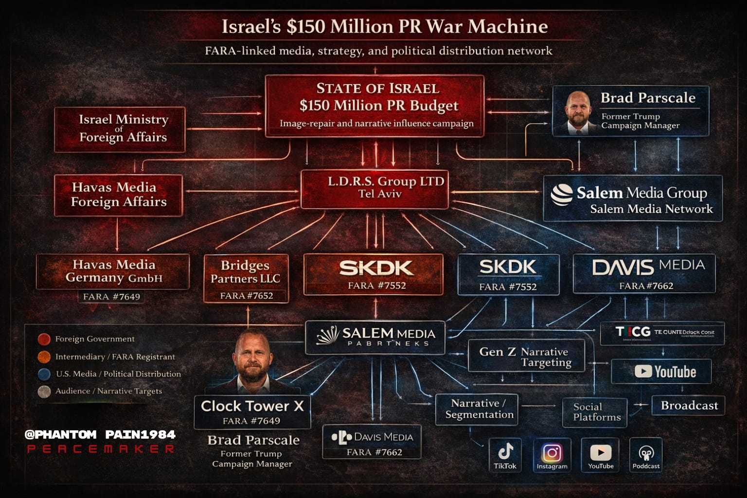 The geopolitical significance of Salem deepens when placed next to Clock Tower X LLC, the FARA-registered entity wholly owned by Brad Parscale. On paper, Clock Tower and Salem are different entities. In practice, the divide is much thinner. Salem appointed Parscale as its chief strategy officer, and the Clock Tower filing explicitly states that the campaign would integrate narrative messaging into “Salem Media Network properties and aligned distribution channels.”