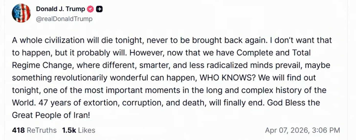 When Trump writes, “A whole civilization will die tonight, never to be brought back again,” he is not threatening only the Iranian government. He is threatening Iran itself. For someone reading that cold, the meaning is obvious: this is not framed as regime pressure. It is framed as civilizational destruction.