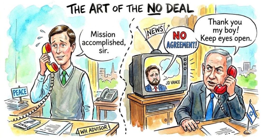 And the diplomatic track appears to fit the same pattern: According to the mediators, the talks did not fail on their own. They broke after Steve Witkoff and Jared Kushner entered the process with Netanyahu’s message and J.D. Vance took Netanyahu’s call.