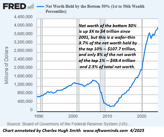 I submit that the United States is in the firm grip of the single-minded few focused solely on maximizing their gains and distributing costs and losses to others by any means available. The social and political restraints that placed modest limits on the aggregation of power and wealth into the hands of the few have crumbled, and this structural collapse has been hidden behind flimsy billboards hyping the latest in distractions: AI, tariffs, stablecoins, Rich Mom fashions, etc.