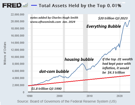 The last trick in the status quo’s hat is a credit-asset bubble that generates an illusion of unending wealth for everyone: wealth for those who own the assets, of course, and wages for everyone below due to the trickle down effect where you buy a $1 million vacation home and I live in my car in a parking lot working in town: