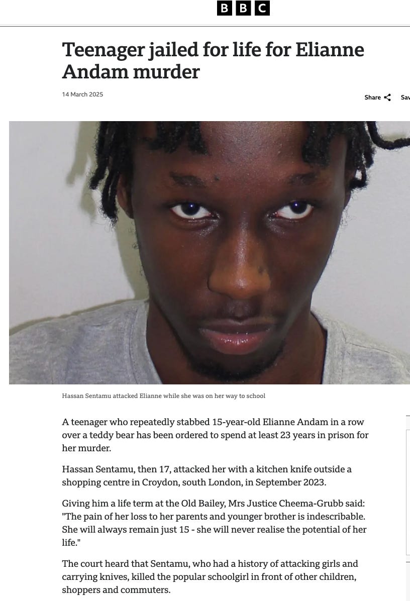 In the real-world case of Elianne Andam, the convicted murderer was Hassan Sentamu, a Black teenager with a documented history of violence, carrying knives, and abusing girls. During his trial, it was revealed he lashed out in a “white-hot” rage over a minor dispute, stabbing the victim mercilessly as she begged for her life.15