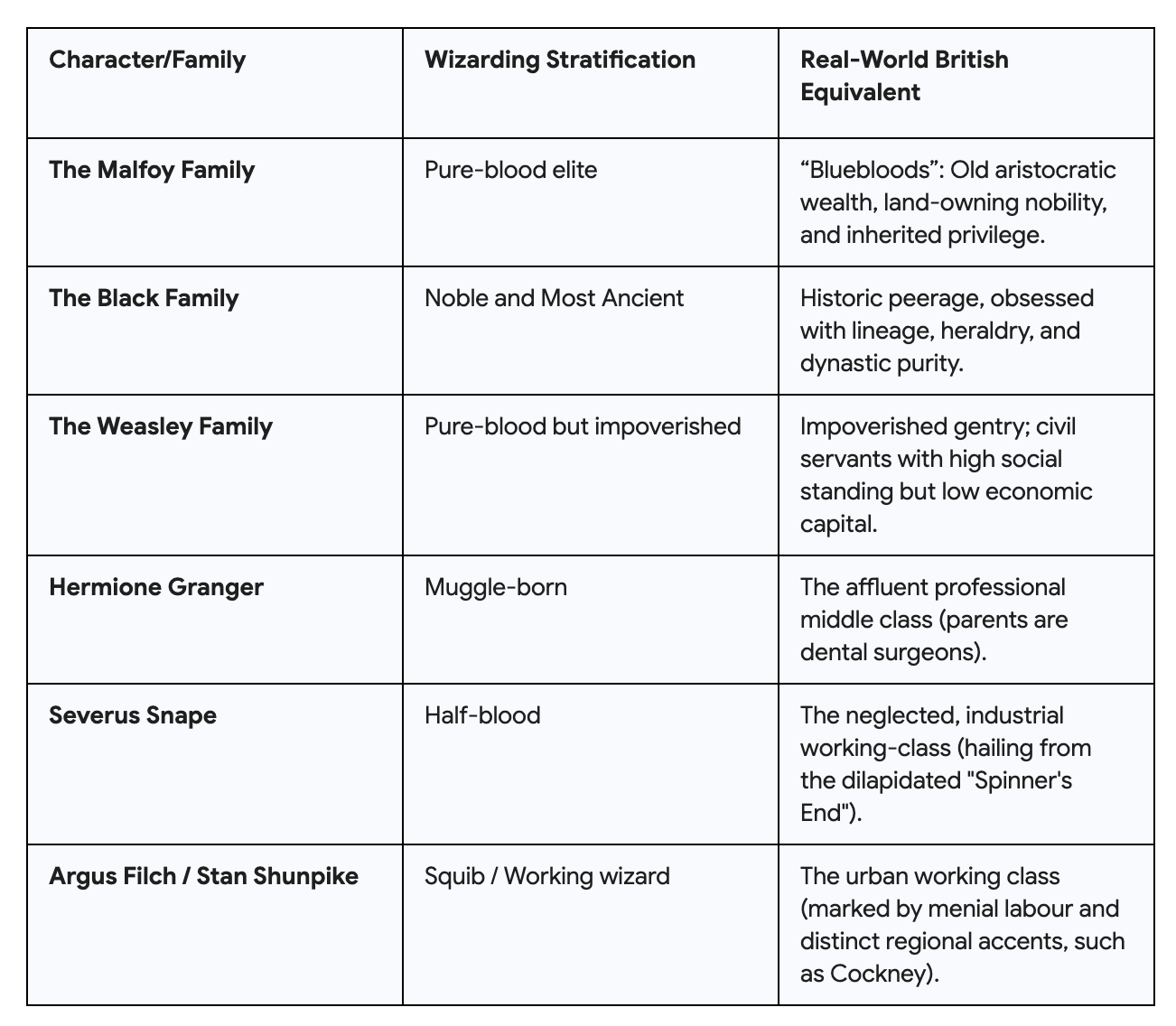 Harry Potter is deeply preoccupied with British class structures. The wizarding society is heavily stratified along lines that perfectly mirror the historical British aristocracy, the emerging middle classes, and the working poor. The central conflicts of the story, prejudice, blood purity, and social mobility are legible precisely because they are mapped onto the highly specific nuances of the British class system.