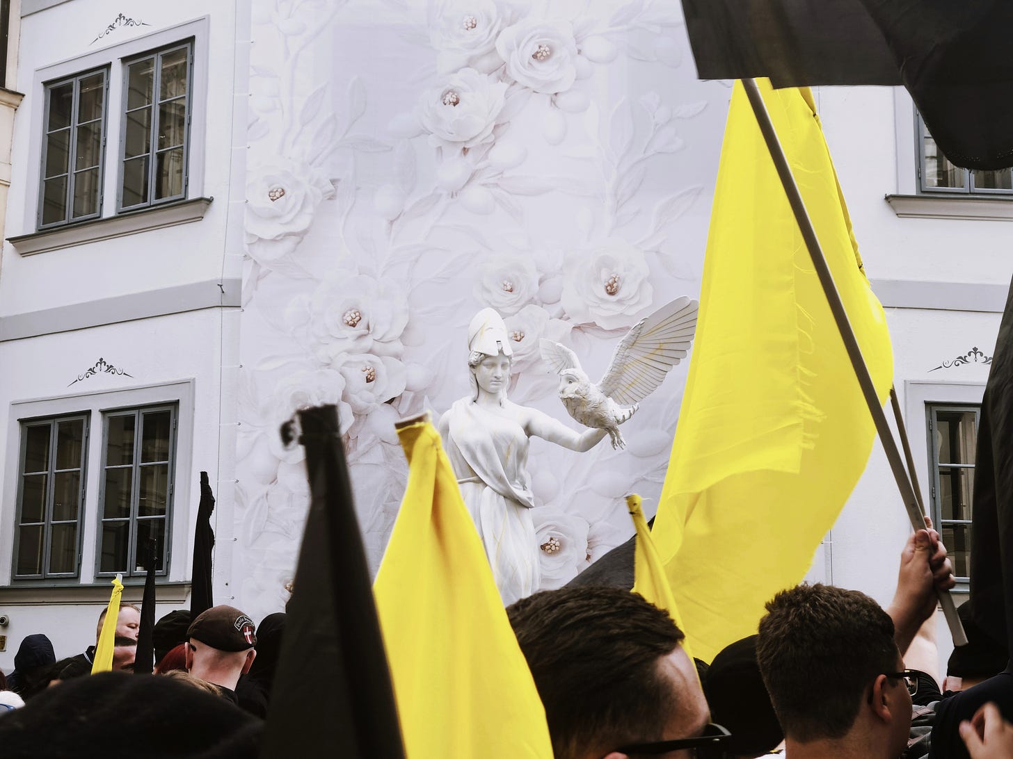 After the initial speeches, the march began, and the crowd of around six hundred patriots from all corners of Europe started to move through the streets, waving black and yellow flags, and holding two great banners with the chief slogans of the day: “Remigration” and “Send Them Back!”. There was a spirit of unity in the air, as sons and daughters of Europe took their message through the streets of the old imperial city. The march was accompanied by many calls for remigration, which were chanted in both German and English. Phrases like “Remigration — Save our Nation”, “Europa, Jugend, Reconquista” (Europe, Youth, Reconquest), “Wien ist unsere Stadt” (Vienna is our city), and others, alongside the two already mentioned main slogans, were thus heard far and wide, and loud and clear, by allies and foes alike.