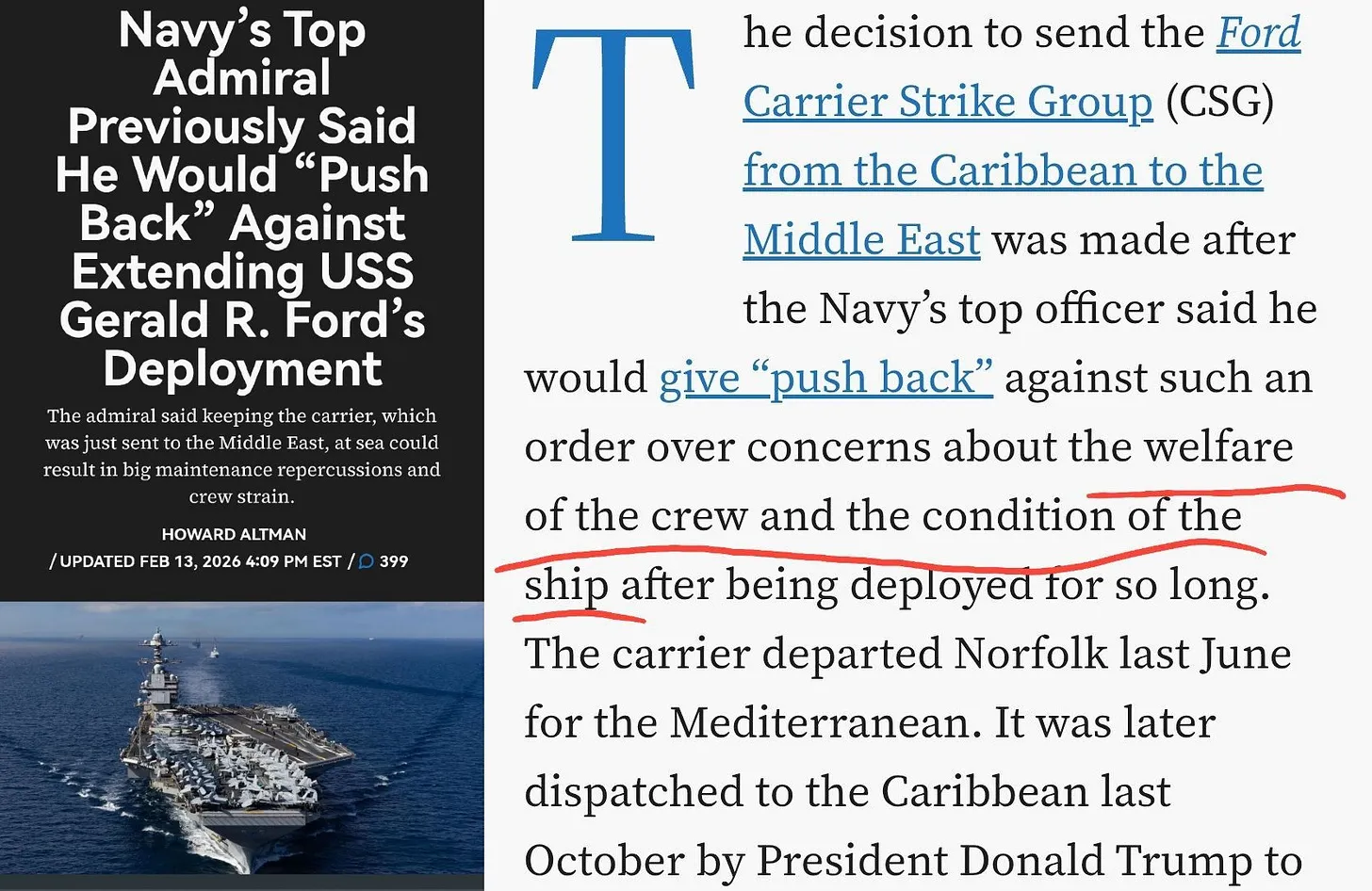 The decision to send the Ford Carrier Strike Group (CSG) from the Caribbean to the Middle East was made after the Navy’s top officer said he would “resist” such an order again due to concerns about the crew’s welfare and the ship’s condition after such a long deployment. The aircraft carrier departed Norfolk last June for the Mediterranean. It was later sent to the Caribbean last October by President Donald Trump to…