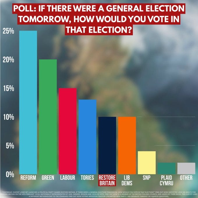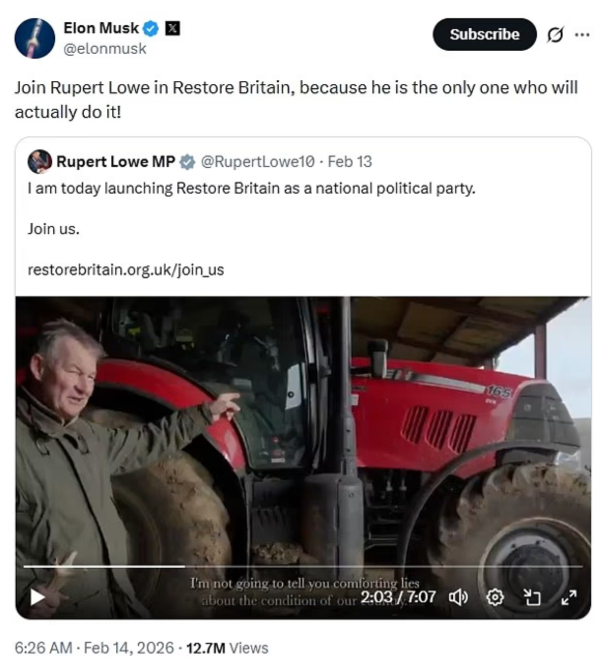 Great Yarmouth MP Rupert Lowe has given Britain an early political Valentine’s gift by formally launching Restore Britain as a national political party. Announced via a video on February 13, 2026, Lowe’s new party promises to field “hundreds of qualified candidates” across the country by the next general election.1 Lowe said he had “no other choice” but to convert Restore Britain from a grassroots movement into a standalone party, after concluding that the existing political options were failing the nation.2 This dramatic move, backed by tech billionaire Elon Musk has electrified Britain’s populist right. Musk, who had signalled a desire for “a credible party to the right of Reform”, urged citizens to “join” Lowe’s cause, calling him “the only one who will actually do it”.3 Such high-profile support underscores the sense that Restore Britain could be the real deal that disenchanted conservative voters have been waiting for.