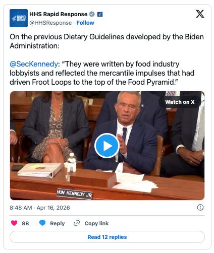 He said he inherited “453 pages” of dietary guidelines from the Biden administration. He called the rules “incomprehensible,” arguing they were shaped by industry influence that “drove Froot Loops to the top of the food pyramid.”