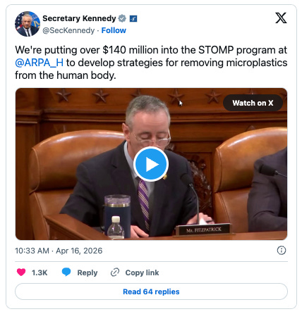 Kennedy also pointed to growing concerns about environmental contaminants, including microplastics and PFAS in food and drinking water, calling their rapid accumulation in the human body “an existential crisis.”