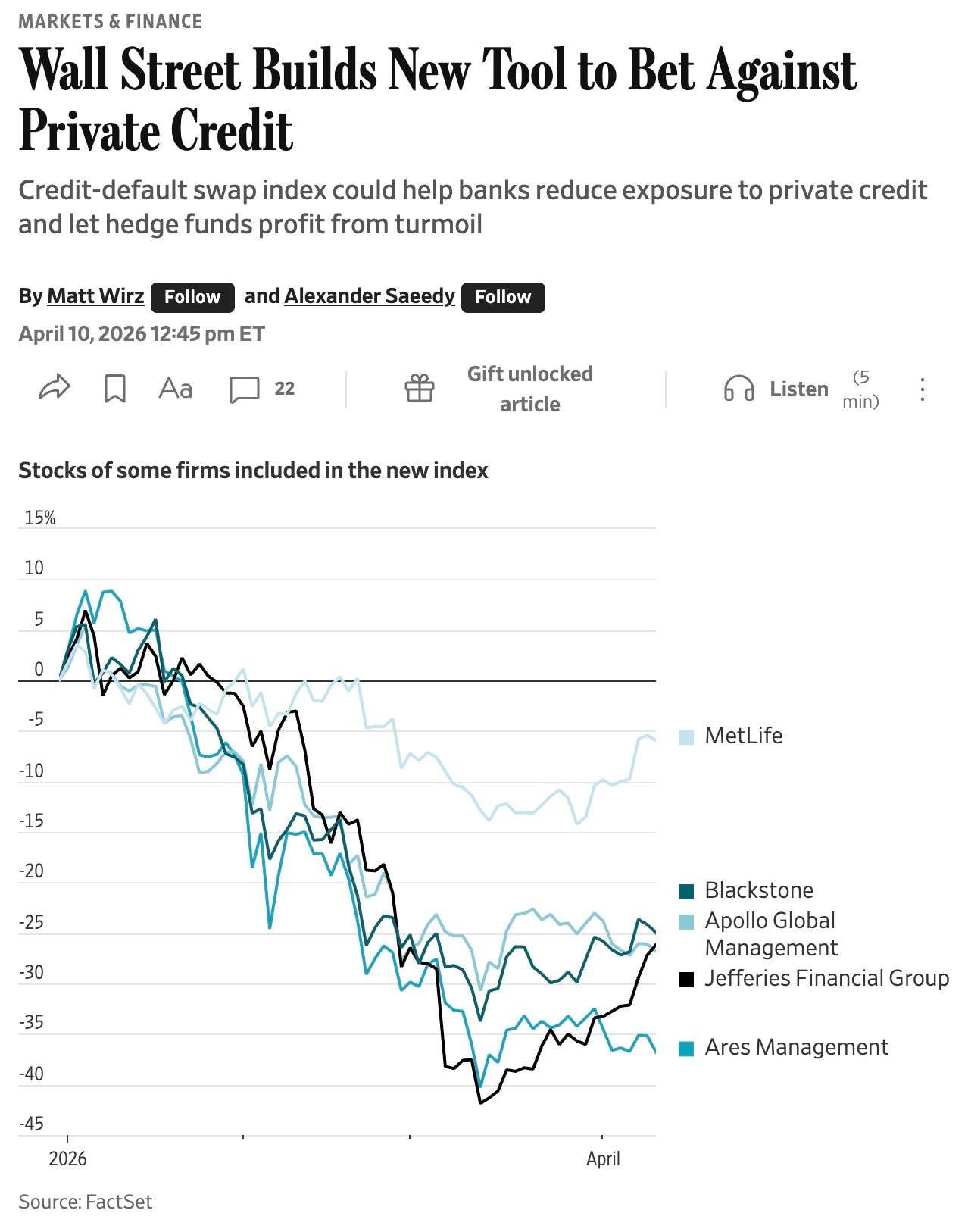The Wall Street Journal wrote yesterday that banks like JPMorgan Chase, working with S&P Global, are rolling out a brand-new shiny instrument: a credit-default swap index tied to private credit exposure. A clean, tradable, scalable way to bet against the very ecosystem they spent the last decade inflating. They’re packaging up the risk, labeling it, and selling access to its failure.
