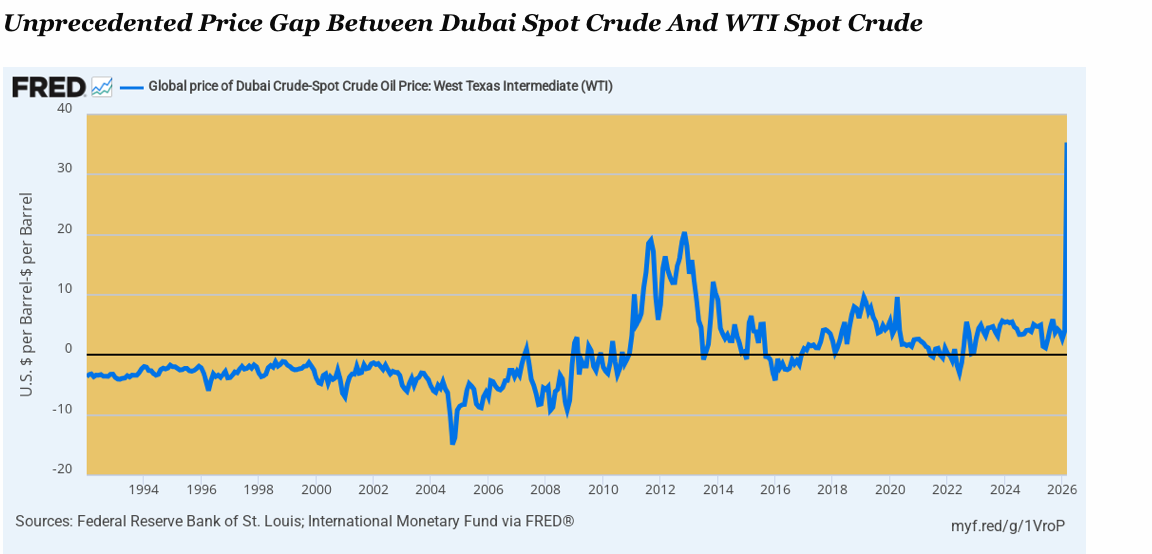 So here’s the thing. If you don’t think an ill wind is blowing in the global economy, take a gander at the graph below, which compares the price for delivered Dubai crude with the WTI cash spot price in Cushing OKLA. Never, ever has the spread at today’s $35 per barrel been remotely this wide. Actually, it has been negative for much of the time since 1990 because US sweet crudes have inherently higher value than the Brent benchmark crude.