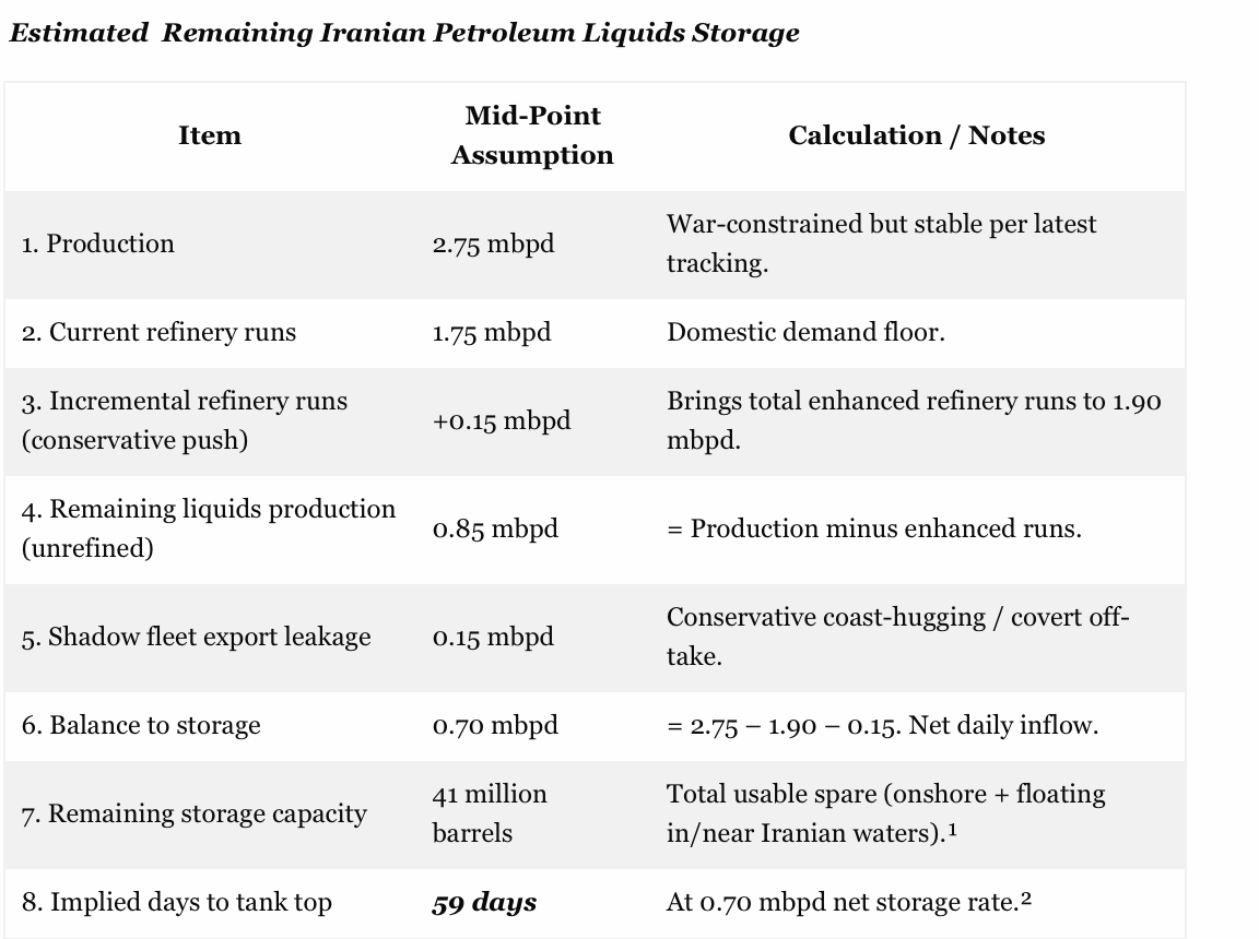 In short, Iran is appears to be very, very far from topping the tank in the next week or two. It may have upwards of 59 days of absorption from current domestic production after allowing for enhanced refinery runs and a modest level of export leakage through the US Navy blockade.