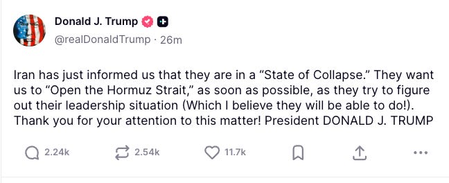 Either way, it’s not surprising that Trump posted this missive earlier today. He apparently actually thinks that his cockamamie Iranian War, which is on the edge of stalemate or actually being lost, is nearly all over except for the shouting.