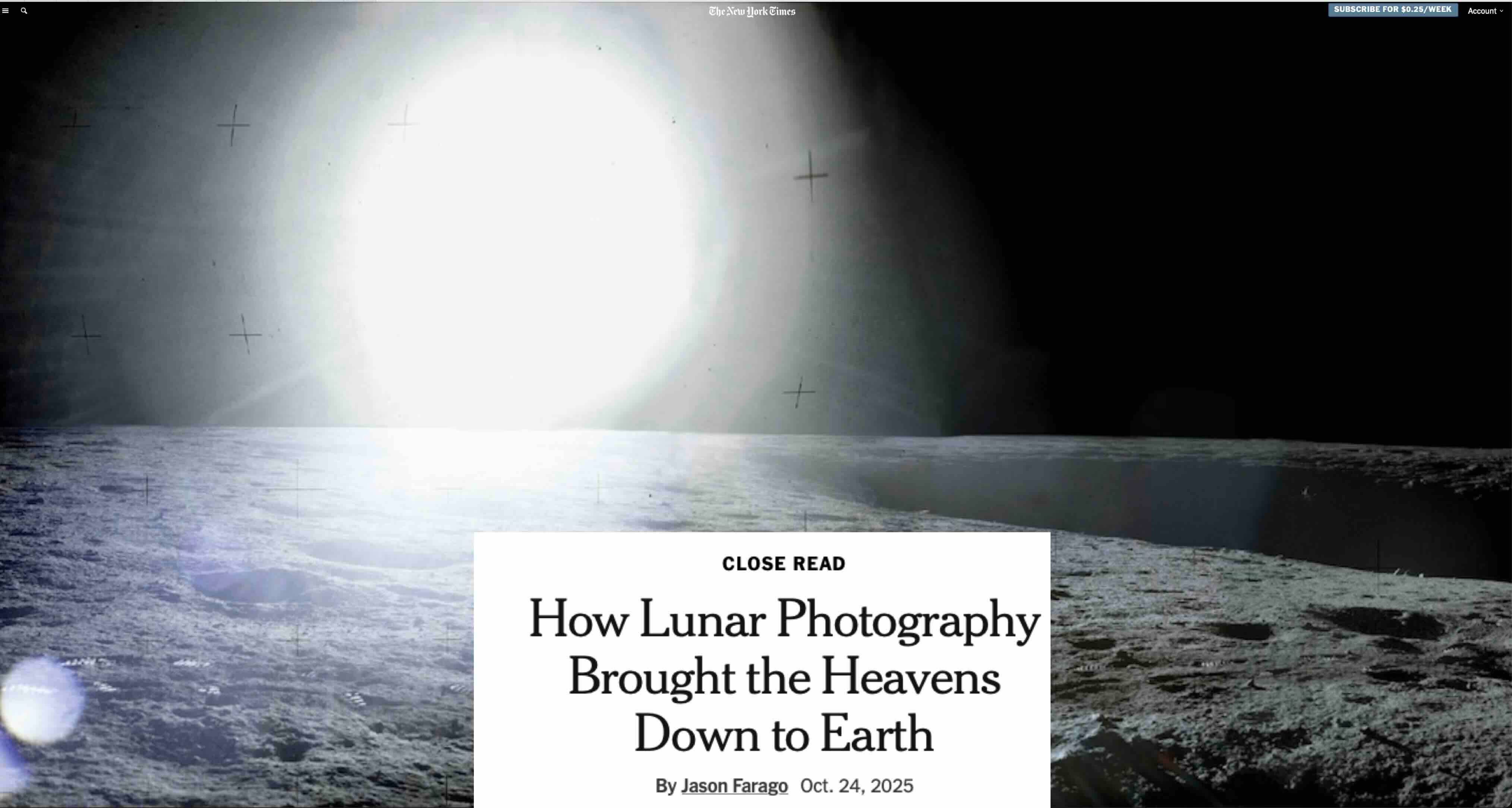 Jason Farago, who appears to be a Deep State propagandist and pro-UkroNazi culture warrior, just published a New York Times interactive photo-video piece headlined “How Lunar Photography Brought the Heavens Down to Earth.” Farago celebrates the alleged artistic genius of the Apollo moon photos, viewing them as the climax of the overlapping artistic and scientific histories of moon explorations and representations.