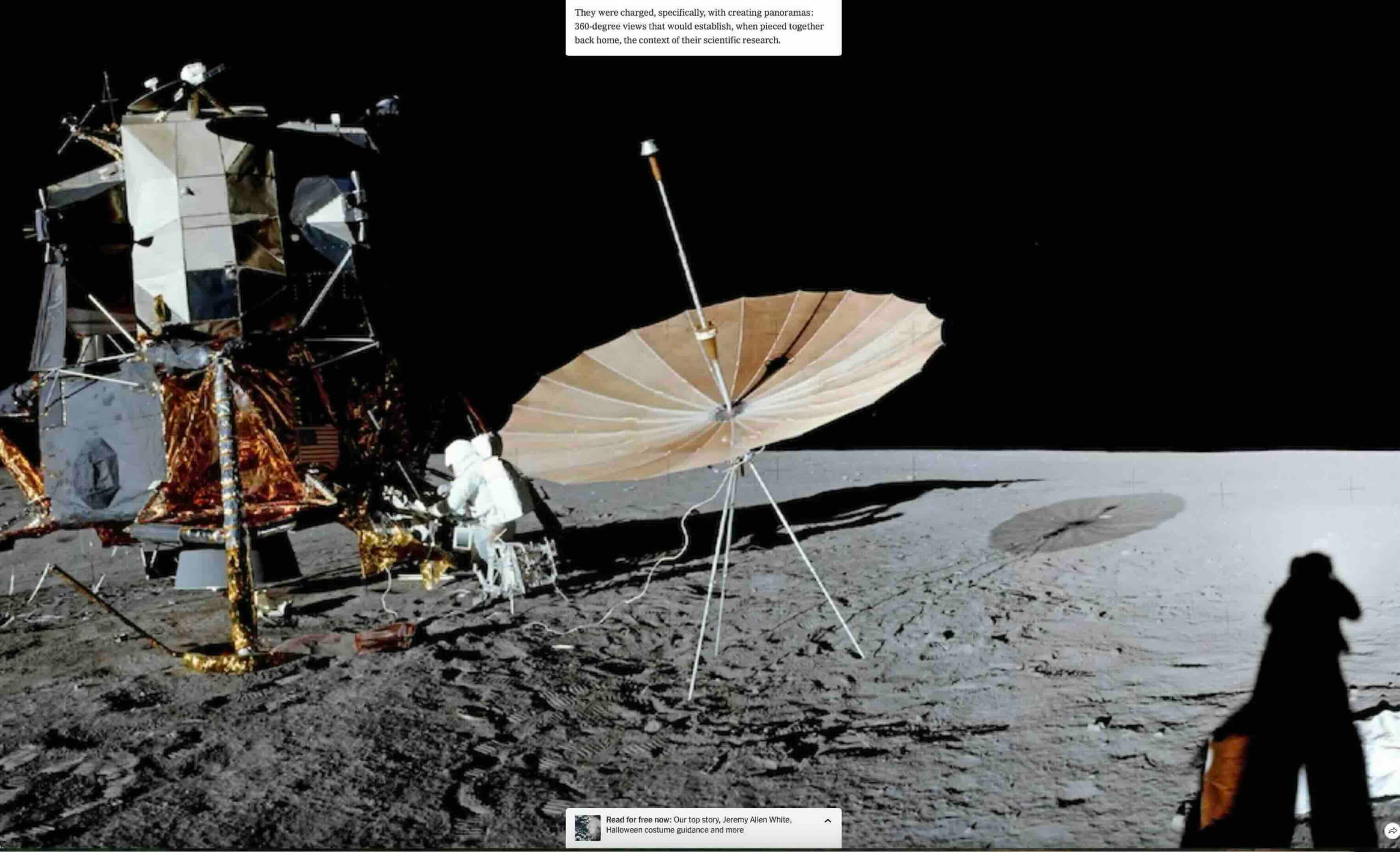 We’re told that they were “tasked with creating panoramas, 360-degree views that would establish when pieced together back home the context of their scientific research.” Then in the New York Times presentation it shows you the 360-degree panorama. Here’s the theme of the whole piece: “In one-sixth gravity, art and science did not seem so far apart.” They’re trying to tell us that the amazing artistry of these photos is some hybrid of art and science.